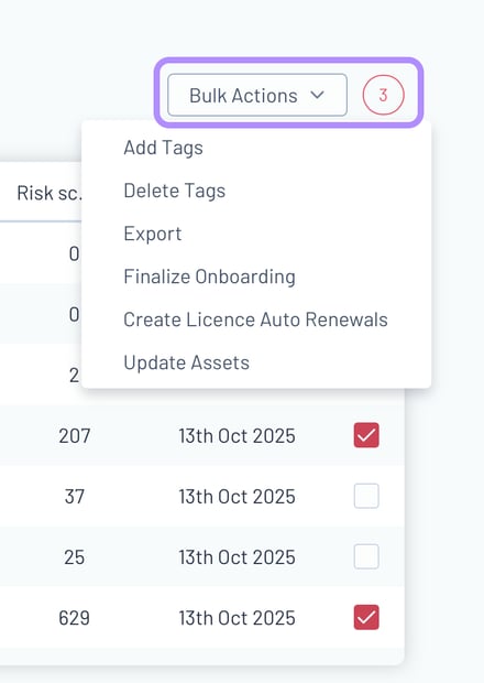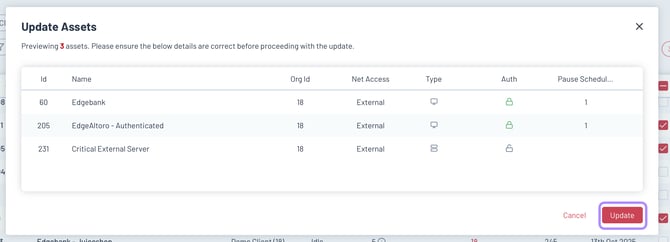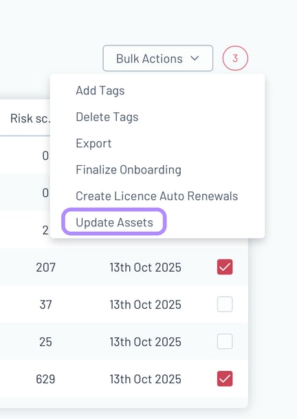 You can update assets in bulk using the update function in the UI. Select the assets you wish to update, and click the bulk actions button on the right of the assets page, then click update and follow the steps in the UI.