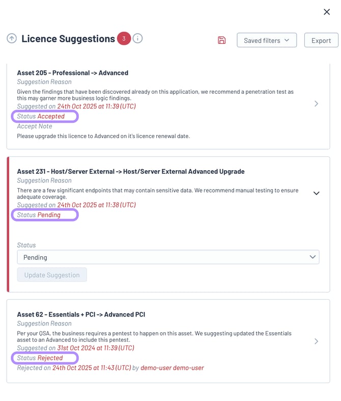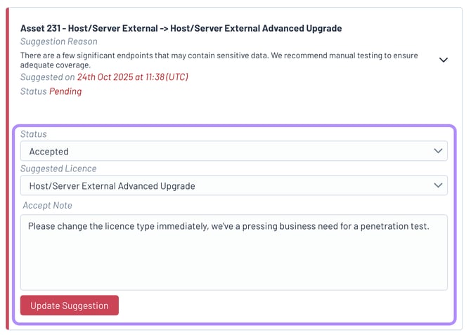 - Each suggestion comes with a reason for the suggestion, and a recommended licence level. There is an optional notes field that can be populated. To change the status of a Licence Suggestion, select from the below options.