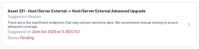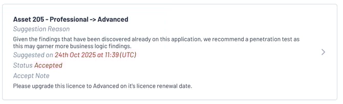 Licence Suggestions can be used to help decide the most appropriate level of testing for your assets in Edgescan. Not all assets require the same level of testing, so we've created Licence Suggestions to help you find the right level of testing for each asset.
