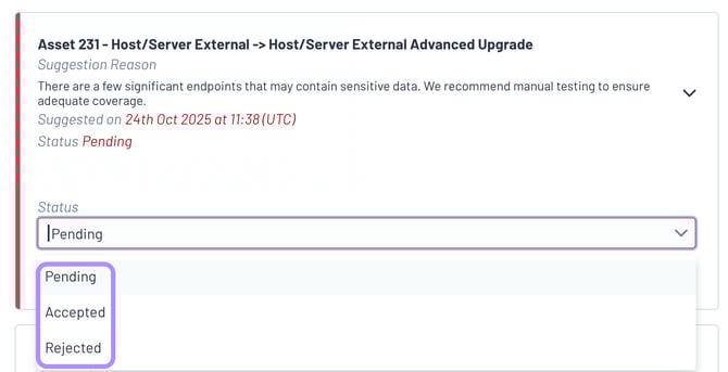 - Rejected - A suggestion has been rejected, this is where a Licence Suggestion was presented, and it was rejected in the UI. We typically recommend adding a rejection reason as this will be added to the asset Audit Trail.