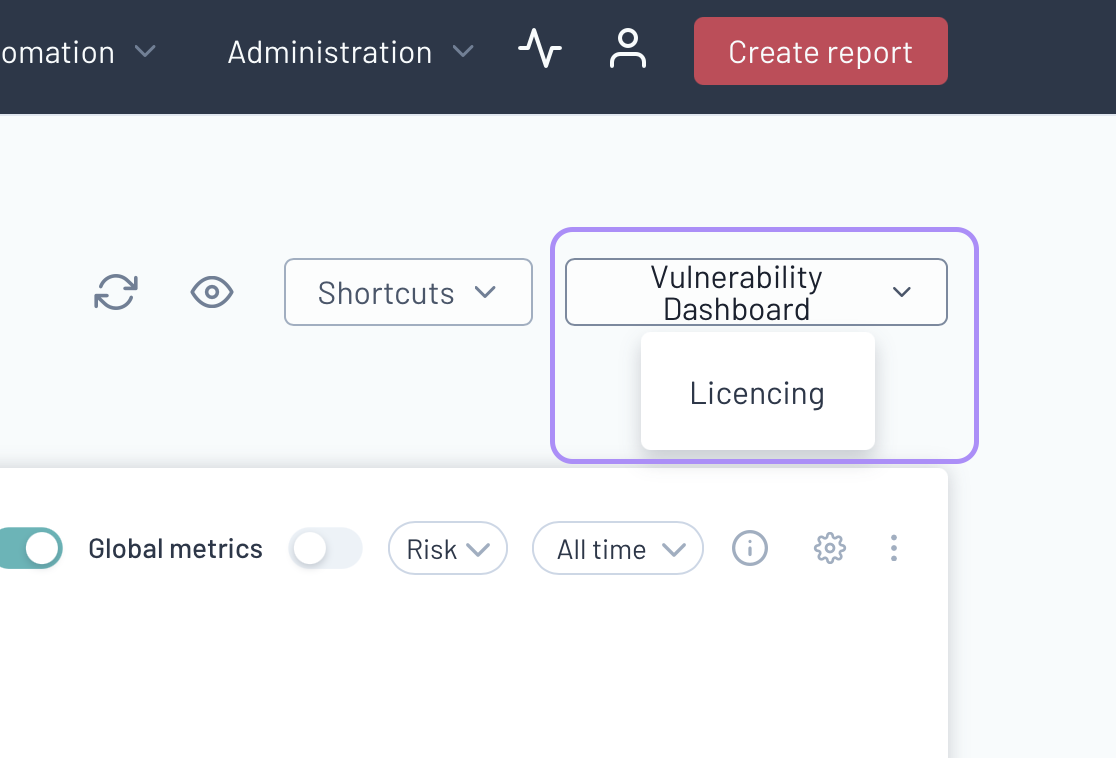 In Edgescan there are 2 default dashboards you can choose from, the vulnerability dashboard and the licences dashboard. Both options are available on the dashboard page of the UI.