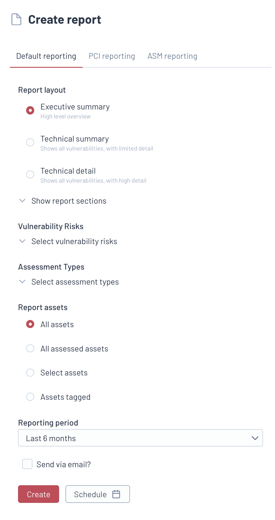 Asset Reporting: You can choose to report on various types of assets, including all assets, all assessed assets, select assets, and tagged assets. This allows for targeted reporting based on your specific needs.