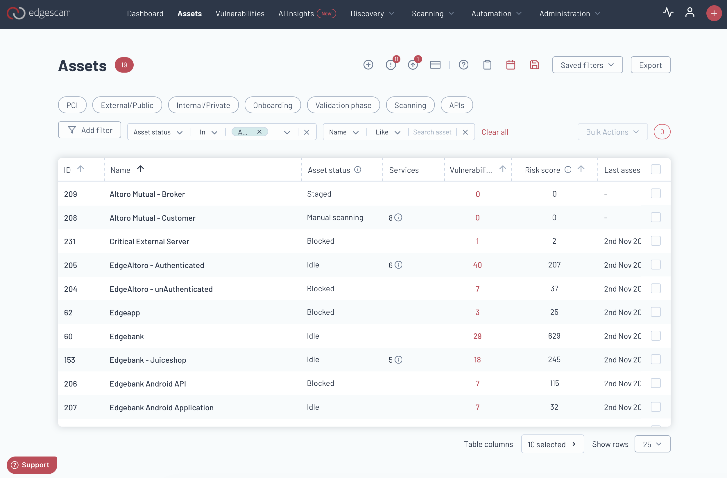 Users can take advantage of enhanced filtering options on the Edgescan Asset Page, allowing them to select multiple filters at the same time for easy categorization of assets. These filters include external/public assets, internal/private assets, ongoing scans, and APIs. Users can further refine their search by asset status or name. Additionally, bulk actions are available for adding and deleting tags, exporting data, updating assets, and setting up license auto-renewals.